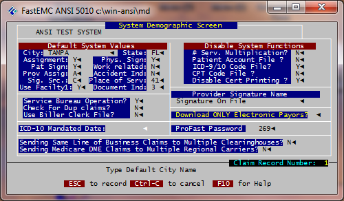Enter the default city. When entering the patient information on the claim, if the City is left blank, the system will supply the default City value when [ENTER] is pressed.